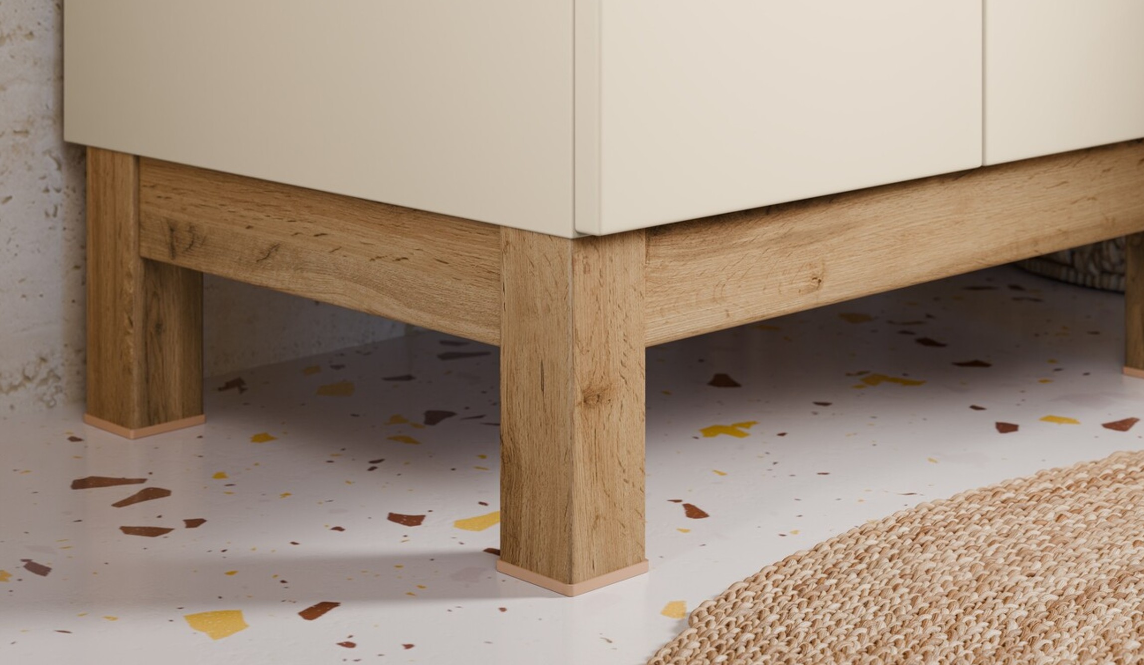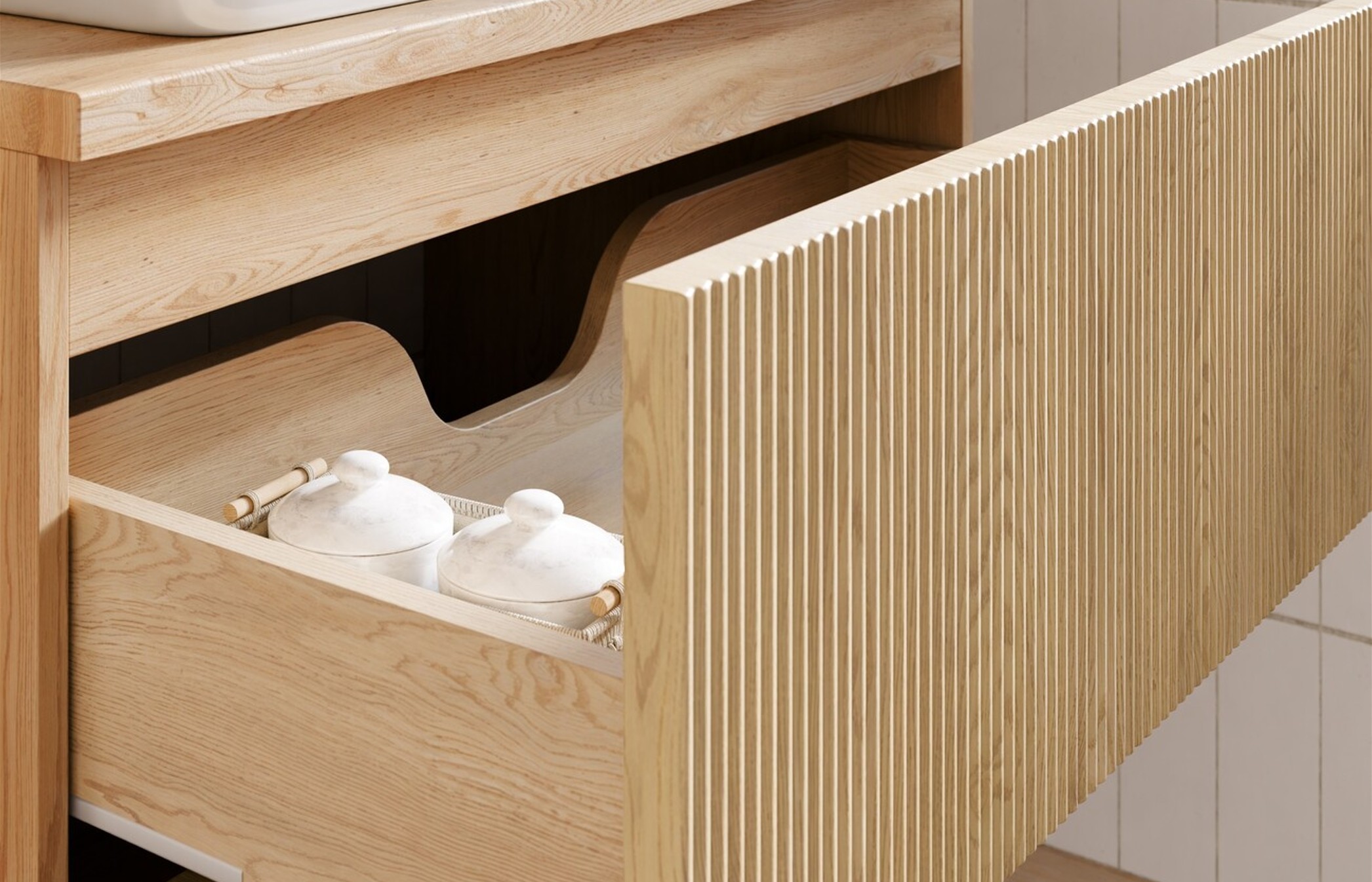 Elegáns, falra szerelhető kialakítás, ritmikus lamellás fronttal. A fiókok praktikus tárolást adnak a napi használatú holmiknak, miközben a tér légies marad.