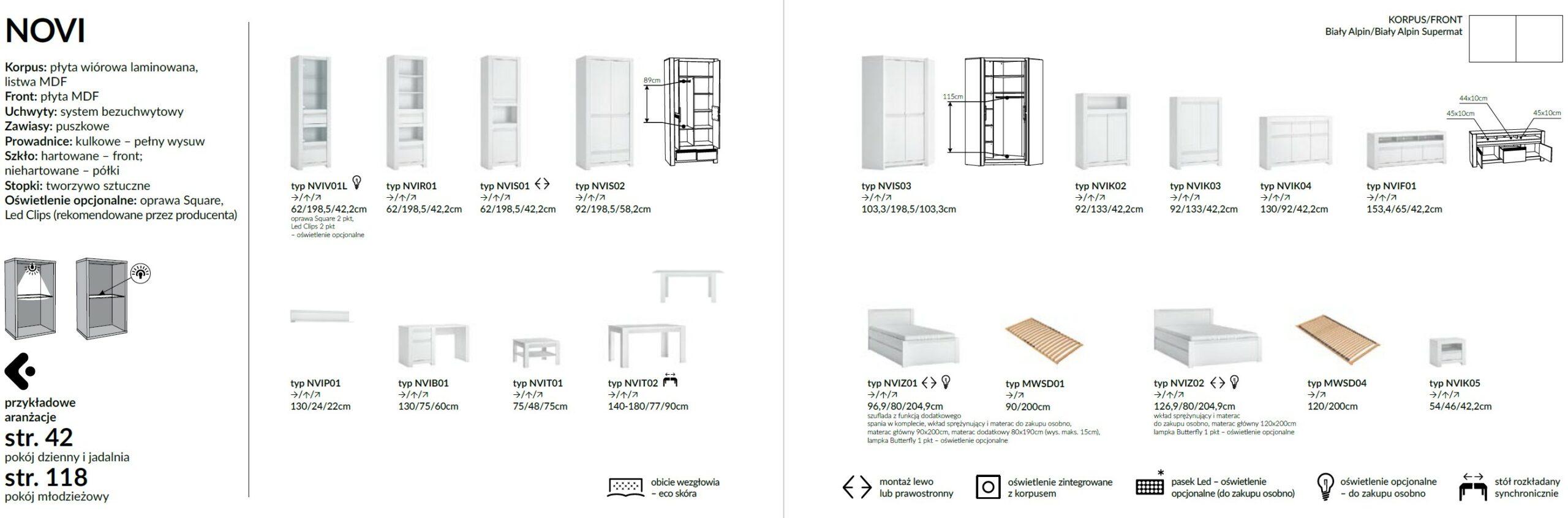 A Novi kollekció egy egyszerű, elegáns forma, amely minden bizonnyal túléli a változó trendek próbáit. A fehér előlapok sima felületét azonos színű barázdált csíkok törik meg, ezzel az egész kollekció arculatát alkotva. A hagyományos fogantyúkat kényelmes fogantyú nélküli rendszerre cserélték. A teljesen kihúzható fiókok, a szinkron vezetők az asztalban és a kiváló minőségű, matt MDF előlapok mindent szép és rendben tartanak. A formák egyetemessége lehetővé teszi a nappali, az étkező és az ifjúsági szoba elrendezését.