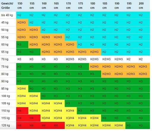• H3 keménységű matrac – a félkemény matracok kategóriája, mely az átlagos testfelépítésű és súlyú emberek számára javasolt 70-től 100 kg-ig.