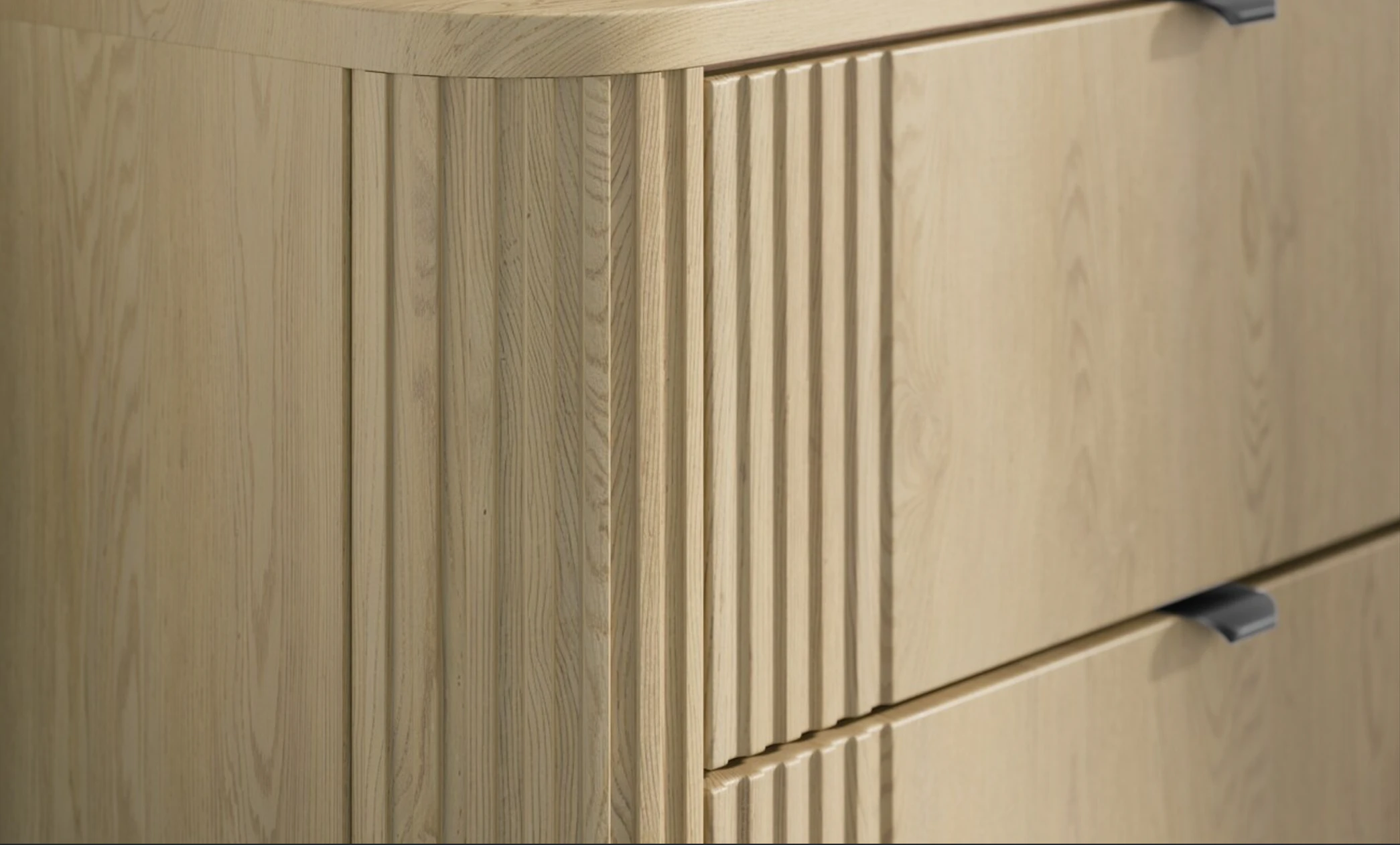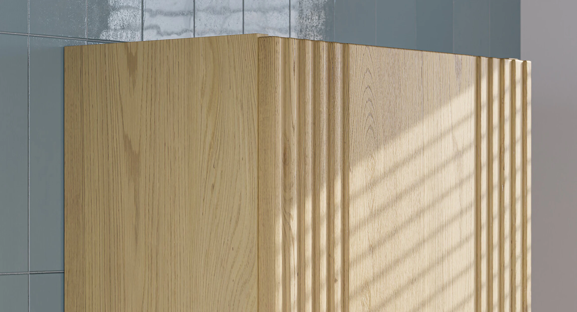 A kollekció egyik legerősebb megkülönböztető eleme a függőleges mart, bordázott részletek használata. Ezek a felületek nem uralják le teljesen a bútort, hanem keretező és hangsúlyozó elemként jelennek meg. Éppen ettől válik kifinomulttá a megjelenés: a simább, erezetes síkfelületek és a strukturált, függőleges sávok egymást erősítik.