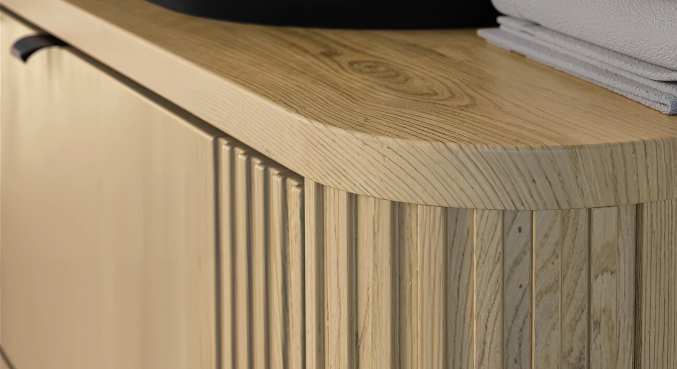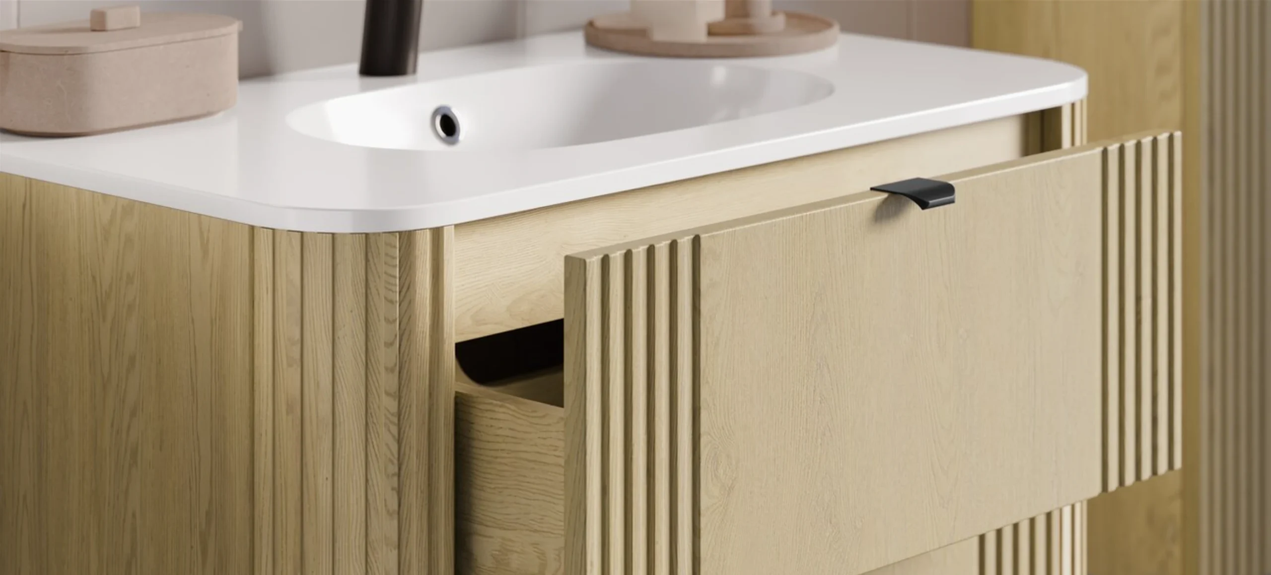 A közeli fotókon szépen megfigyelhető, hogy a bordázott részek nem öncélú díszítések. Segítenek tagolni az előlapokat, vizuális ritmust adnak a bútorfrontnak, és még egy egyszerűbb, homogén enteriőrben is emelik a berendezés szintjét. Egy jó modern fürdőszoba bútor pontosan ettől lesz több egy egyszerű tárolóelemnél: karaktert ad a helyiségnek anélkül, hogy túlzsúfoltnak vagy túl hangosnak hatna.