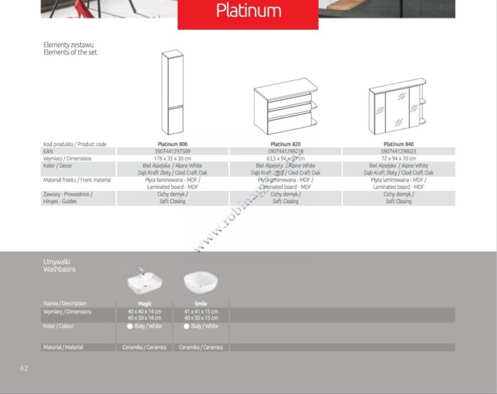 A Platinum kollekció modern bútor fehér színben, a fa árnyalataival, amelyek természetessé és stílusossá teszik a bútorokat. A ráültetett mosdókagyló szekrénye lehetővé teszi a mosdó saját vizuális és funkcionális igényeinek megfelelő beállítását. A mosdószekrényhez illesztett tükör függő szekrény és egy magas szekrény teszi egységessé a készletet.