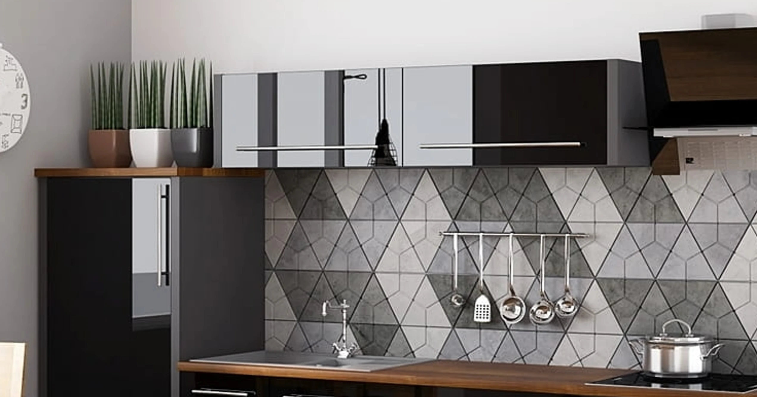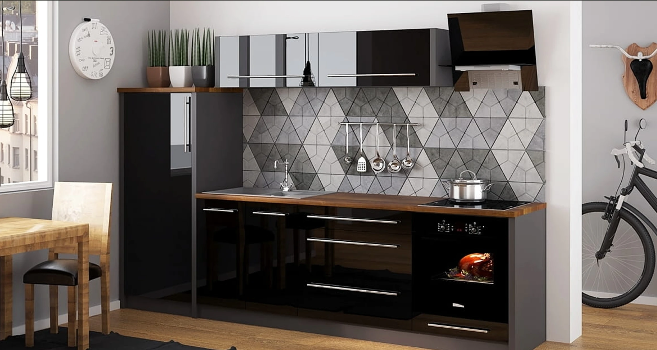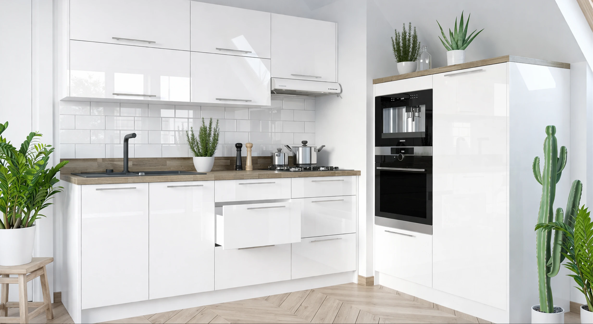 A modern konyhabútor fogalma ma már nemcsak annyit jelent, hogy a front sima és fényes. A mai elvárások között ugyanúgy ott van a rendszerezettség, az ergonomikus használat, a könnyebb takaríthatóság, a jó helykihasználás és az is, hogy a konyha vizuálisan illeszkedjen a nappalihoz, étkezőhöz vagy a nyitott élettérhez. A PLATINIUM ilyen szempontból is erős választás, mert a fényes frontok, a szabályos osztások és a markáns vízszintes fogantyúk olyan egységes képet adnak, amely nem esik szét akkor sem, ha a konyha nagyobb tér része. A fekete-fehér összeállítások különösen jól működnek loft, minimalista, modern és urban stílusú otthonokban.