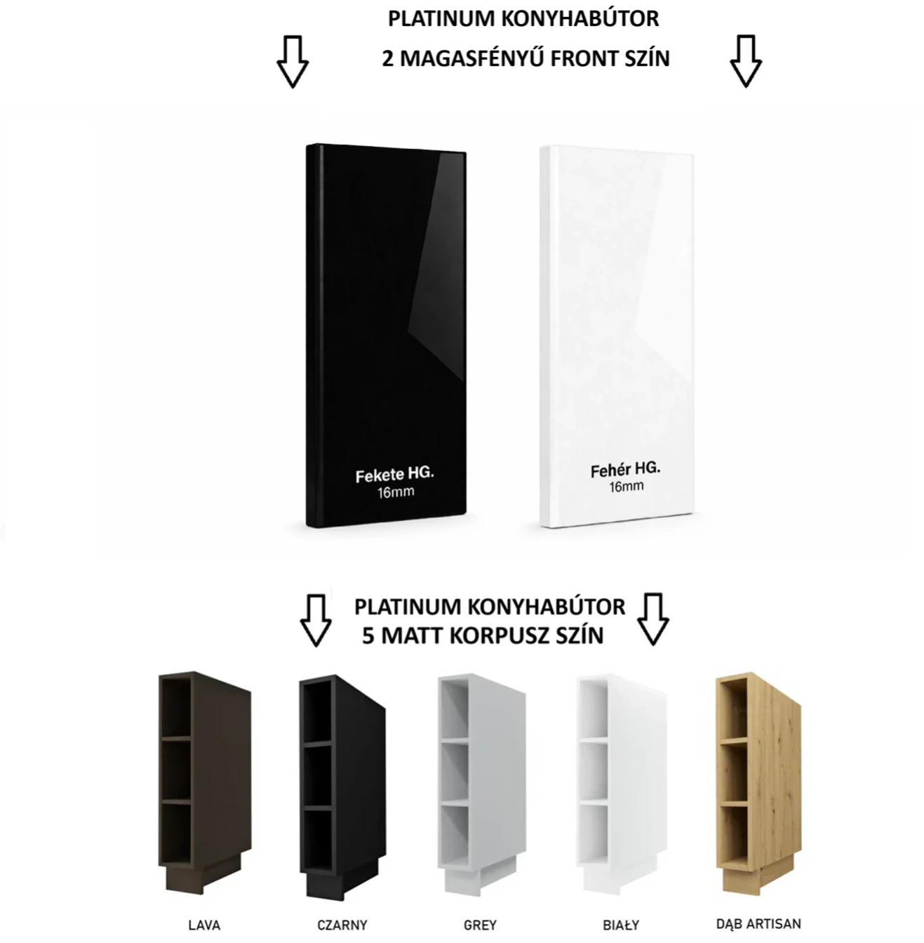A PLATINUM különösen jó választás lehet akkor, ha olyan modern konyhabútor megoldást keresel, amely egyszerre illik világos, minimalista enteriőrbe és kontrasztos, fekete-fehér, markáns stílusú térbe is. A gyártói színválaszték alapján két frontszín érhető el: a fekete magasfényű és a fehér magasfényű változat. Ezekhez öt eltérő korpuszszín társítható. Ez a kombináció nemcsak esztétikai szabadságot ad, hanem abban is segít, hogy a konyha jobban illeszkedjen a padlóhoz, a falburkolathoz, a munkalaphoz vagy akár a beépített gépek tónusához. A front és a korpusz tudatos párosításával visszafogott, elegáns vagy kifejezetten karakteres összhatás is létrehozható.
