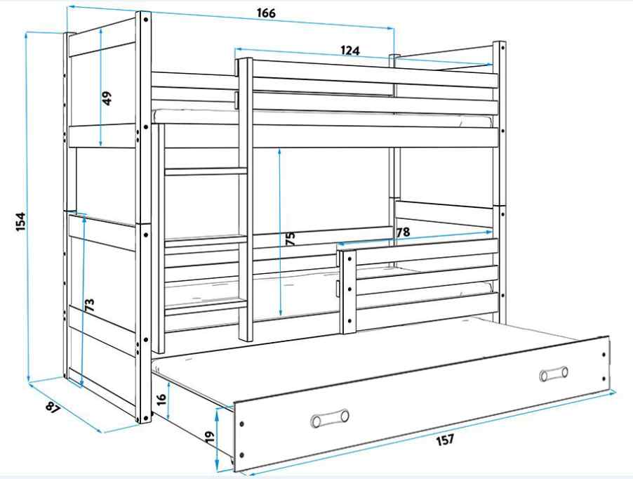 Fekvő felület mérete: 160 cm x 80 cm , 160 cm x 80 cm , 150 cm x 80 cm (fekhelyenként max. 100kg a teherbírás !)