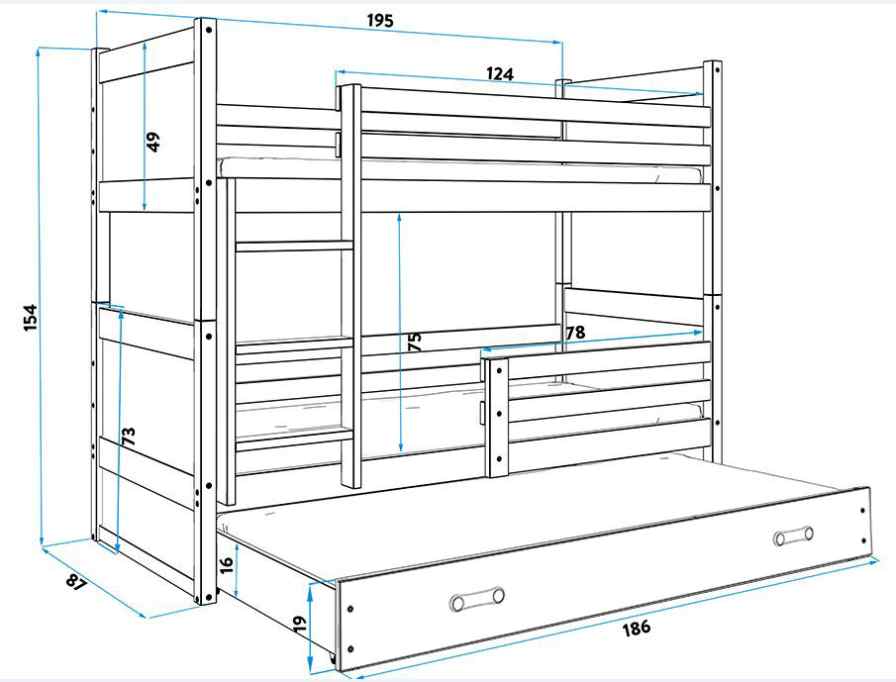 Fekvő felület mérete: 190 cm x 80 cm , 190 cm x 80 cm , 180 cm x 80 cm (fekhelyenként max. 100kg a teherbírás !)