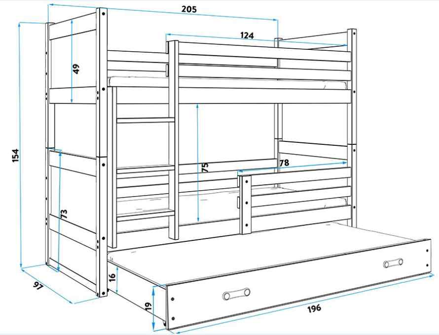 Fekvő felület mérete: 200 cm x 90 cm , 200 cm x 90 cm , 190 cm x 80 cm (fekhelyenként max. 100kg a teherbírás !)