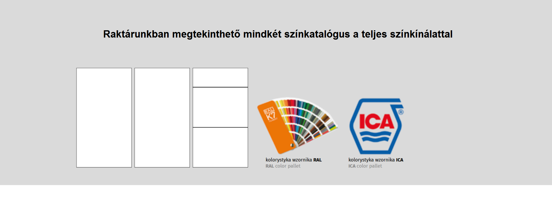 A színválasztással kapcsolatos esetleges félreértések és kellemetlenségek elkerülése végett fontos tudni, hogy a monitor színbeállítása és felbontása miatt a képen látható színek eltérőek lehetnek és nem biztos, hogy a valós színeket adja vissza a kép, ezért célszerű a valóságban a raktárunkban megtekinteni a rendelni kívánt színeket. Ennek ellenére természetesen a saját felelősségére mindenki élhet a lehetőséggel, hogy internetről válasszon színt! ( Az ICA és a RAL színskála raktárunkban rendelés elött megtekinthető!)
