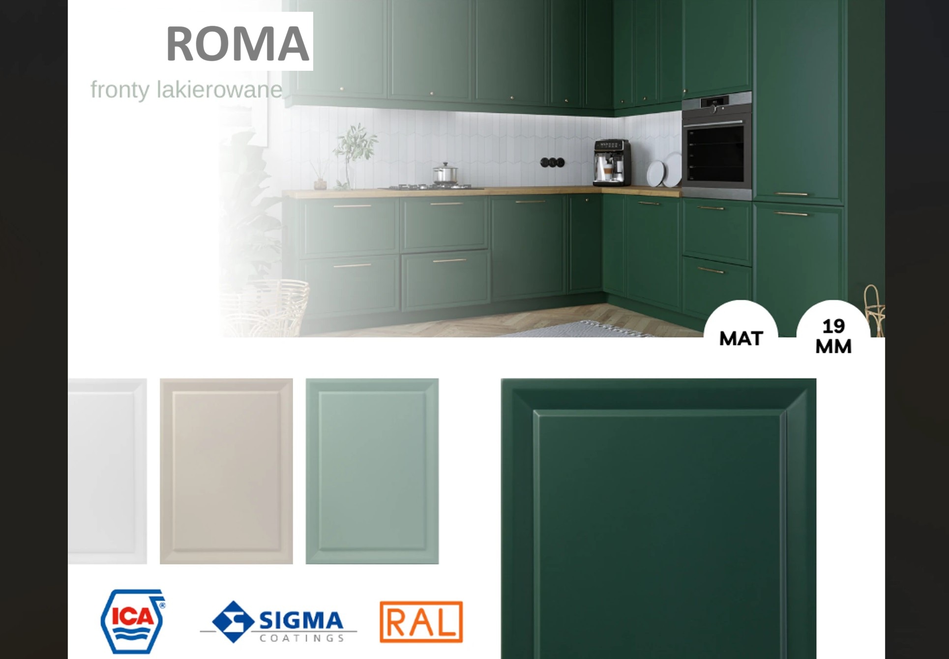 A csatolt képek alapján a ROMA több színvilágban is erős. A fehér árnyalatok tágasabb, világosabb hatást keltenek, a zöld és a kék verziók trendérzékeny, karakteres hangulatot teremtenek, a grafit és sötétebb tónusok pedig prémiumabb, markánsabb enteriőrökben lehetnek igazán látványosak. A gyártó oldala szerint a frontok RAL és ICA mintaszínek szerint érhetők el, míg a korpusz többek között fehér, grey, lava, artisan tölgy és fekete színben választható. Ez kifejezetten jó lehetőséget ad az egyedibb konfigurációkra.