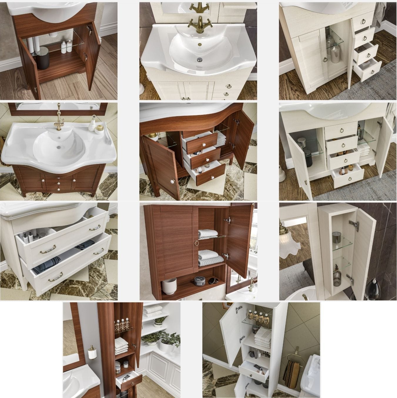 Klasszikus kialakítású bútorok, amelyek lehetővé teszik a fürdőszoba hagyományos stílusban történő elrendezését.