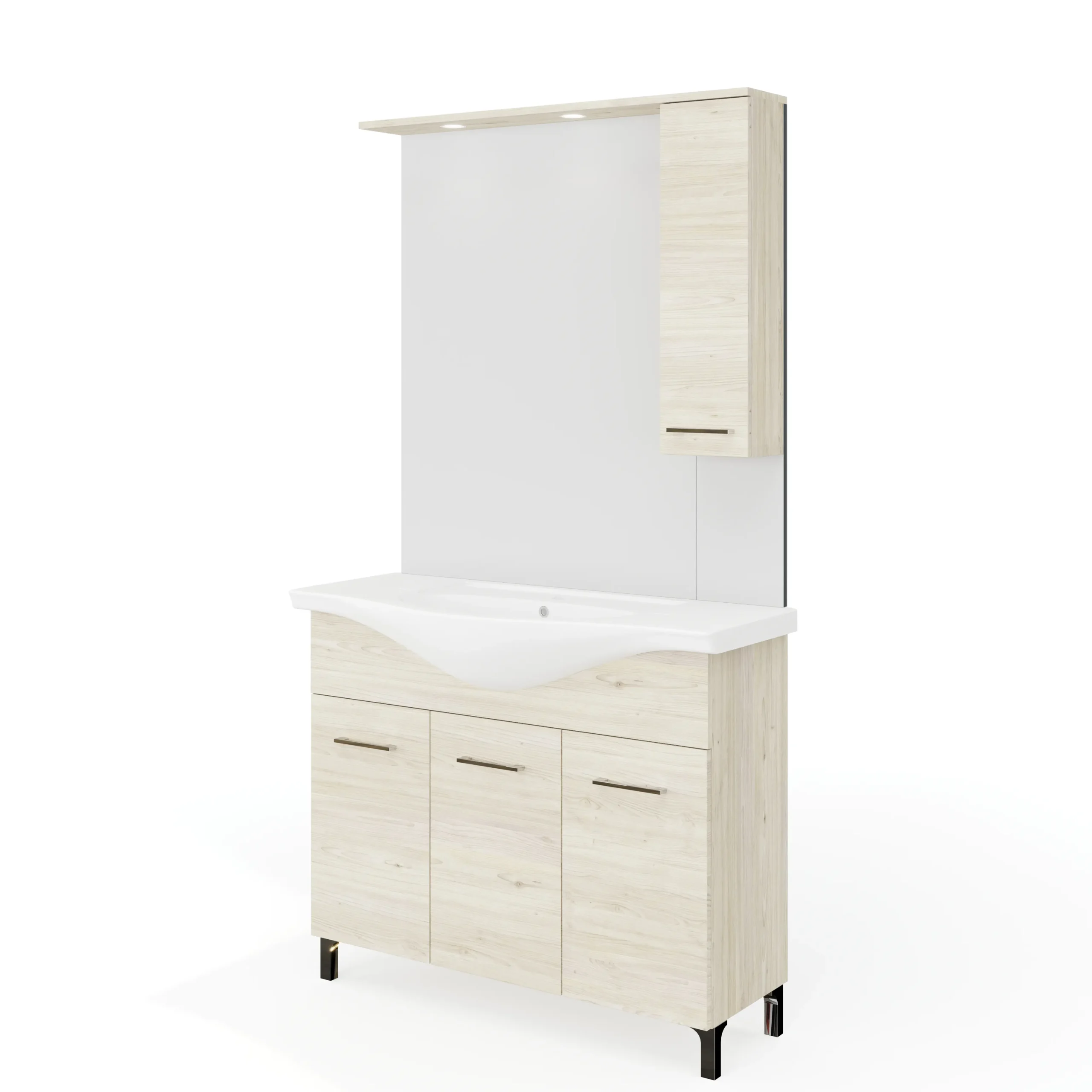 | RUBINO | 4515+4525D | 105 cm | Rovere Ghiaccio | Alsó szekrény + Mosdó + Tükör szekrénnyel | Rubino fürdőszobabútor 106 cm kerámia mosdóval (3 ajtós) + oldalszekrényes tükör 99×102 cm 2 spot LED lámpa |