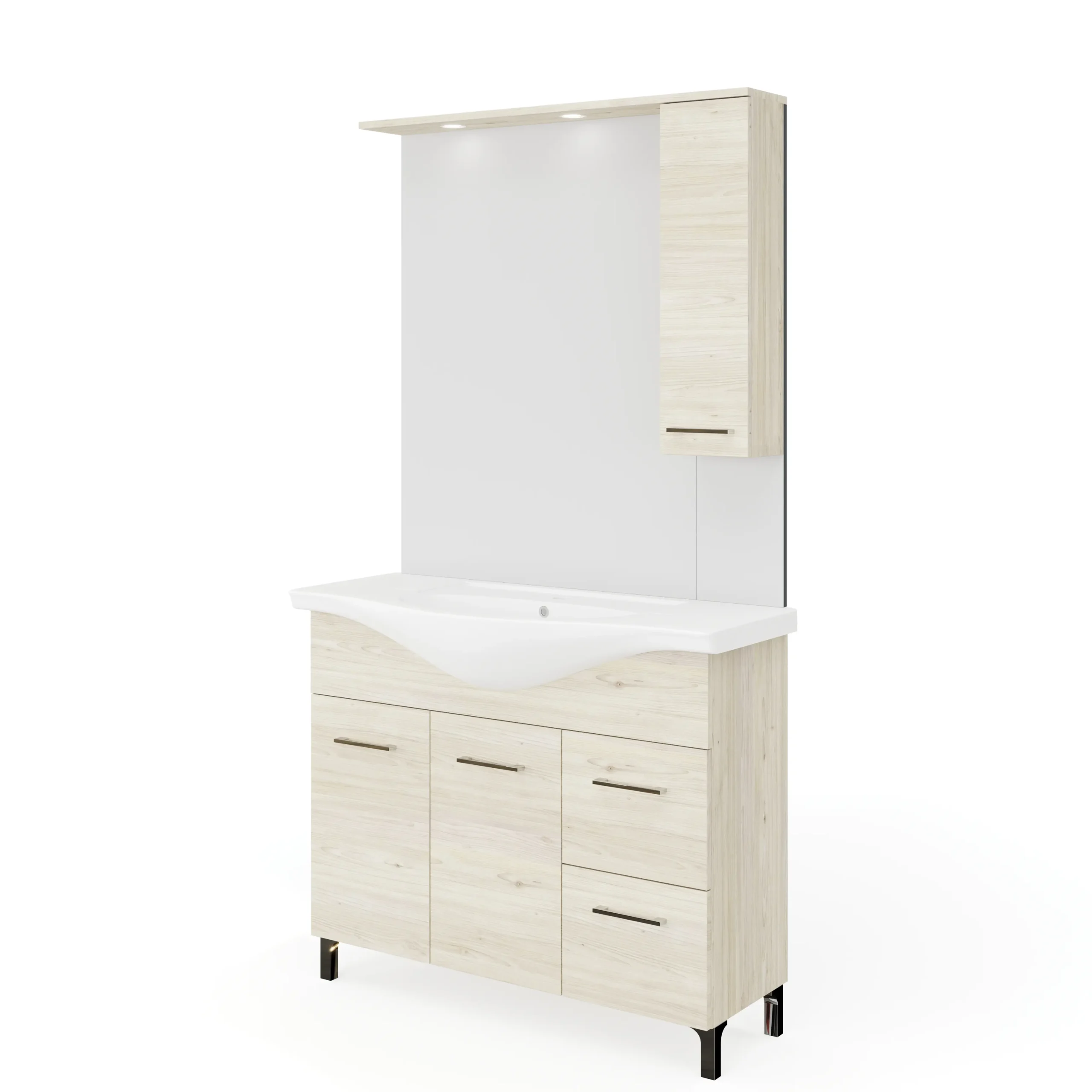 | RUBINO | 4517+4525D | 105 cm | Rovere Ghiaccio | Alsó szekrény + Mosdó + Tükör szekrénnyel | Rubino fürdőszobabútor 106 cm kerámia mosdóval (2 ajtós+2 fiokos) + oldalszekrényes tükör 99×102 cm 2 spot LED lámpa |