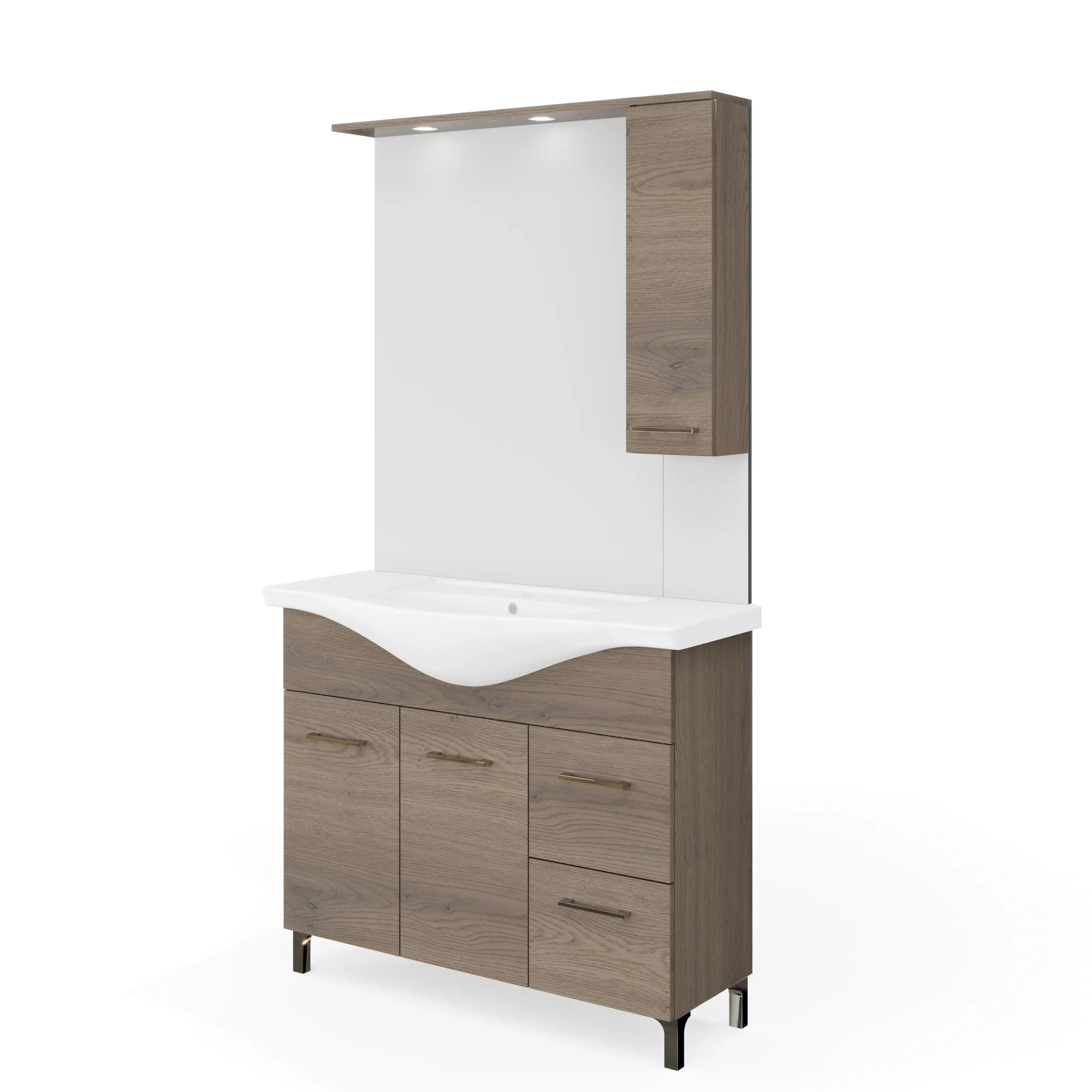 | RUBINO | 4617+4625D | 105 cm | Noce Americano | Alsó szekrény + Mosdó + Tükör szekrénnyel | Rubino fürdőszobabútor 106 cm kerámia mosdóval (2 ajtós+2 fiokos) + oldalszekrényes tükör 99×102 cm 2 spot LED lámpa |