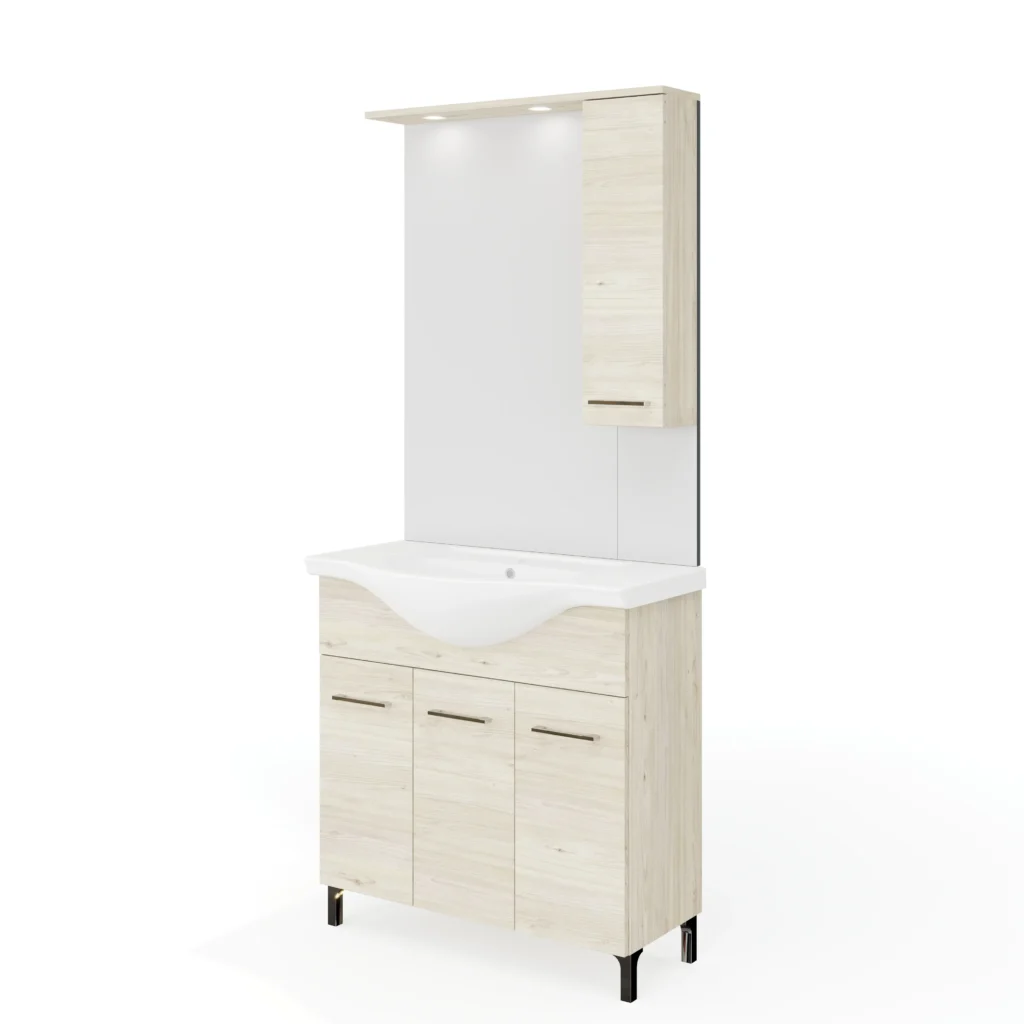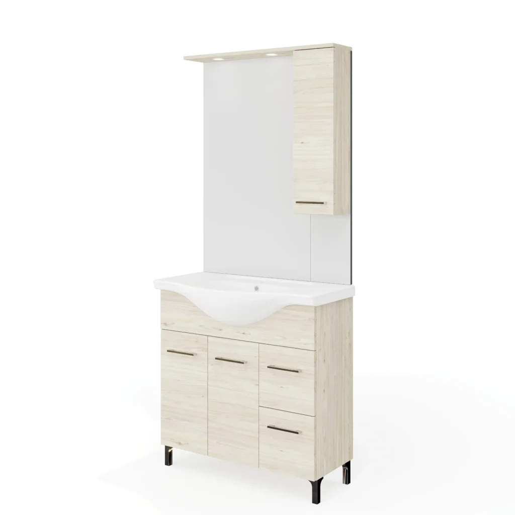 A korpusz Rovere Naturale laminált faforgácslap ABS élzárással készül, a front is Rovere Naturale laminált faforgácslap ABS élzárással. Ez a dekor különösen jó választás családi fürdőszobákba, ahol fontos a barátságos és időtálló összhatás.