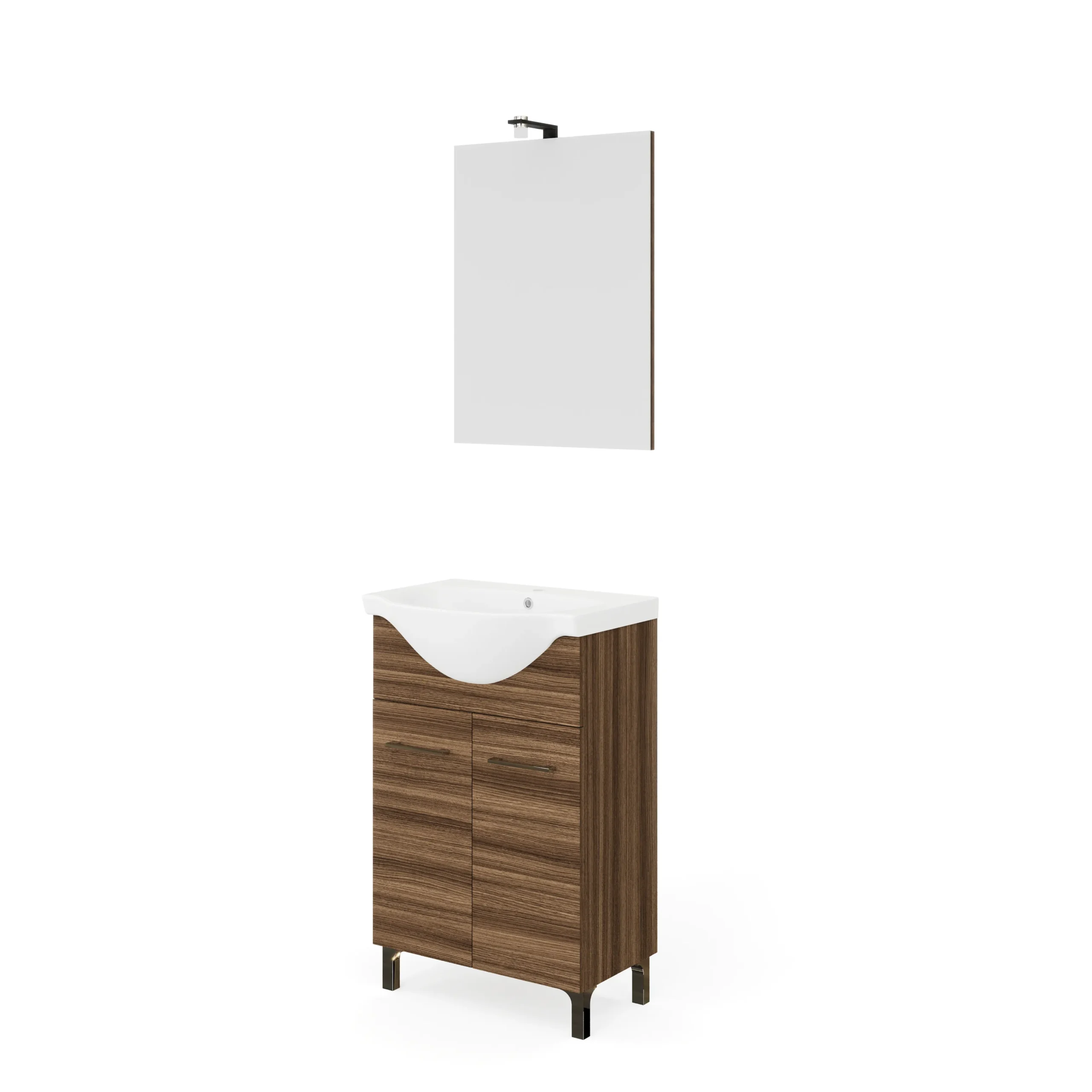 | RUBINO | 4701+213/EL | 55 cm | Rovere Moka | Alsó szekrény + Mosdó + Tükör | Rubino fürdőszobabútor 58 cm kerámia mosdóval (2 ajtós) + Laptükör 52×68 cm lámpa nélkül |
