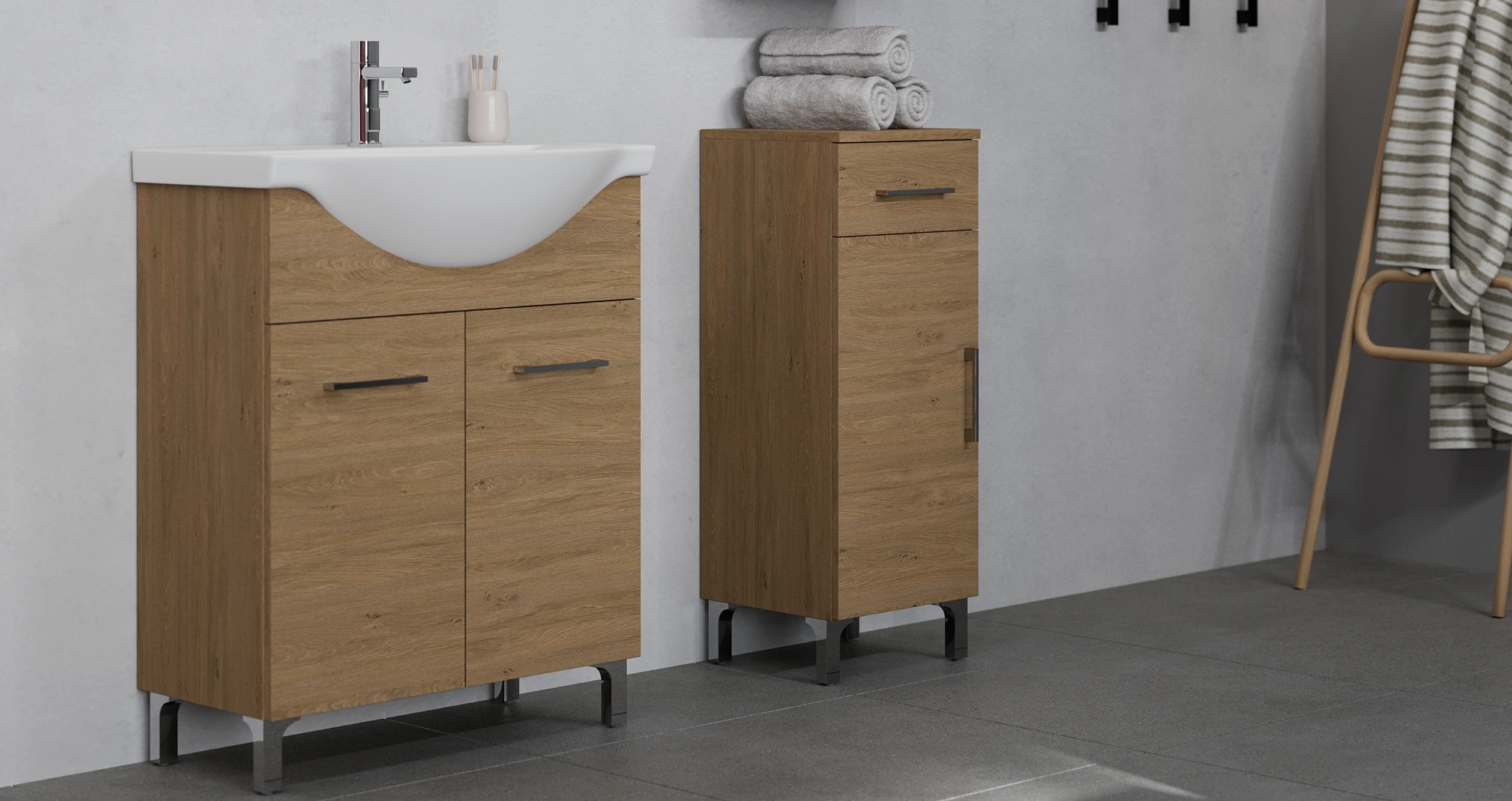 Akár egy kis alapterületű fürdőbe keresel kompakt mosdósszekrény megoldást, akár teljes fürdőszoba bútor szett mosdóval összeállításban gondolkodsz, a RUBINO NEW család praktikus és esztétikus választás lehet. A 55, 65, 85 és 105 cm-es méretopciók révén könnyebb megtalálni az ideális modellt, a famintás felületek pedig segítenek abban, hogy a fürdőszoba ne csak funkcionális, hanem otthonos is legyen.