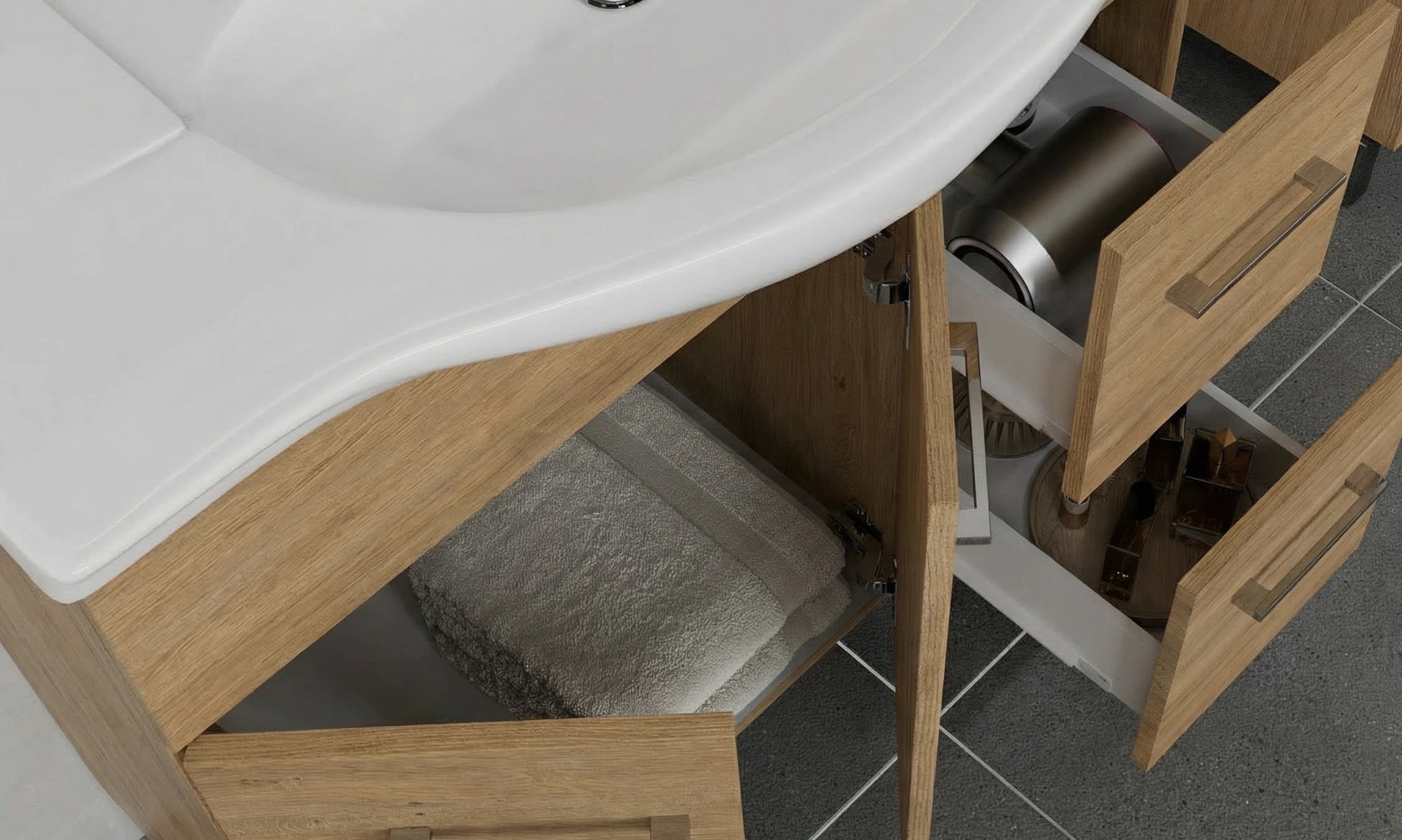 A korpusz Rovere Naturale laminált faforgácslap ABS élzárással készül, a front is Rovere Naturale laminált faforgácslap ABS élzárással. Ez a dekor különösen jó választás családi fürdőszobákba, ahol fontos a barátságos és időtálló összhatás.