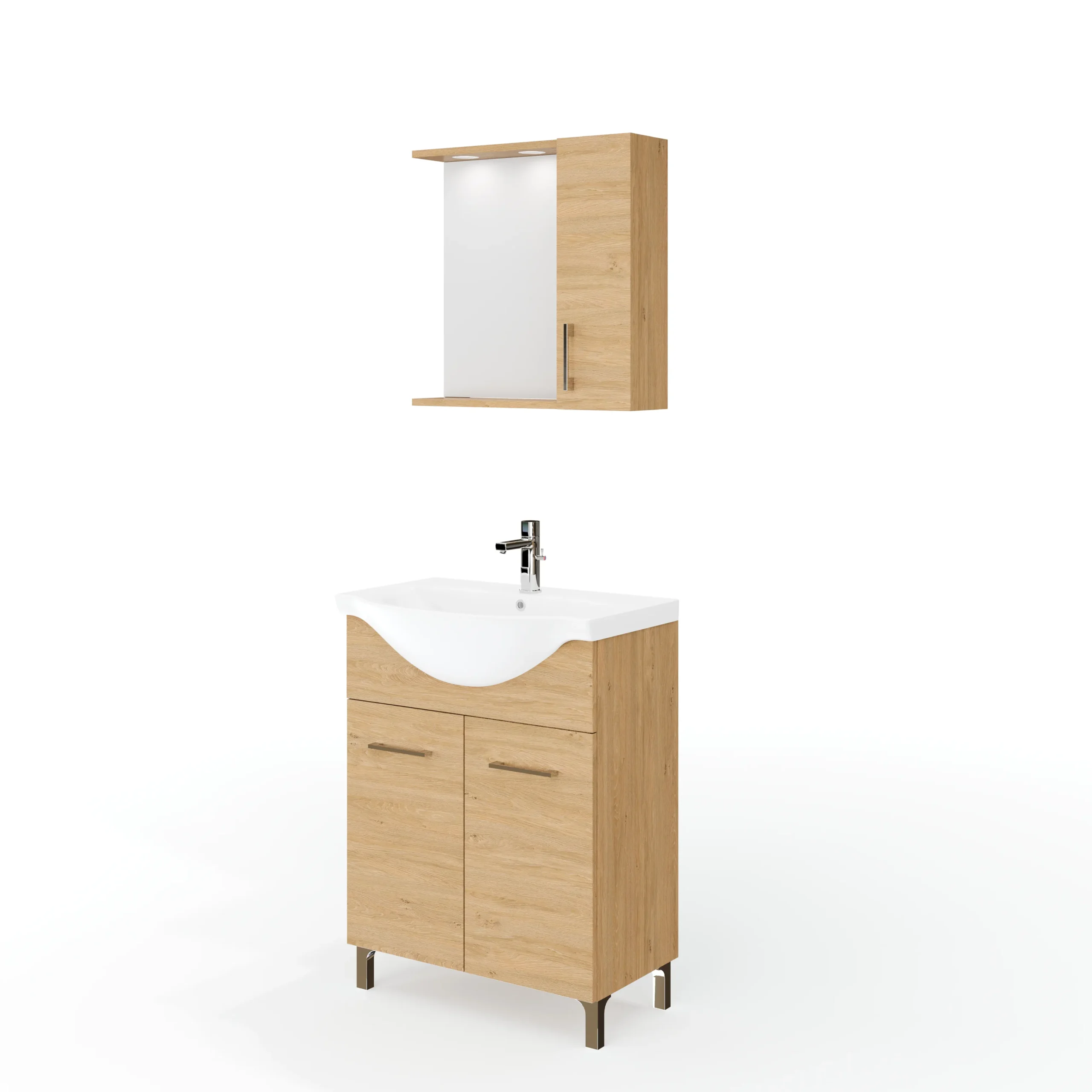 | RUBINO | 4803+4895/LED | 65 cm | Rovere Naturale | Alsó szekrény + Mosdó + Tükör szekrénnyel | Rubino fürdőszobabútor 67 cm kerámia mosdóval (2 ajtós) + oldalszekrényes tükör 58,5×57 2 spot LED lámpa |