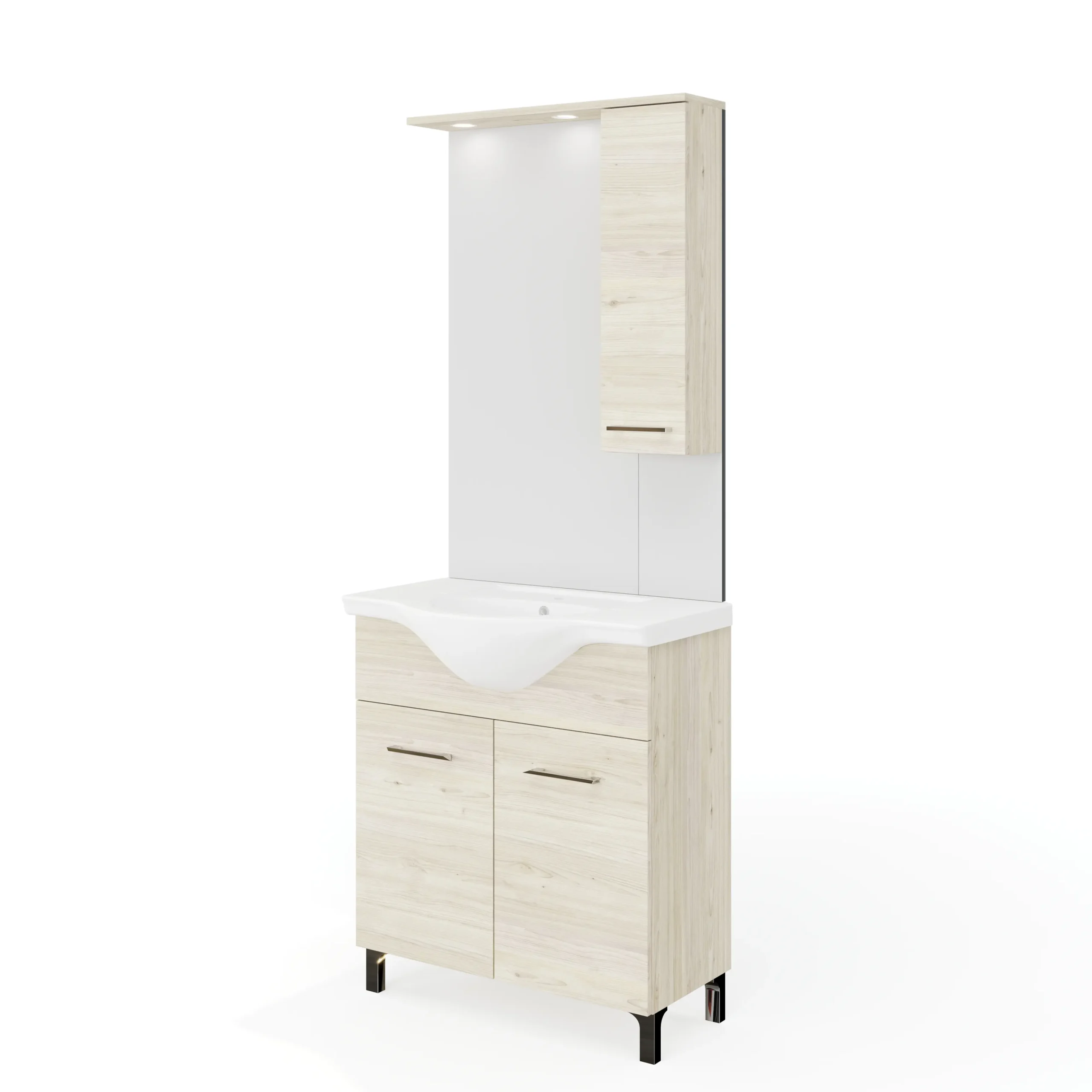 | RUBINO | 4505+4523D | 75 cm | Rovere Ghiaccio | Alsó szekrény + Mosdó + Tükör szekrénnyel | Rubino fürdőszobabútor 76 cm kerámia mosdóval (2 ajtós) + oldalszekrényes tükör 70×102 cm 2 spot LED lámpa |