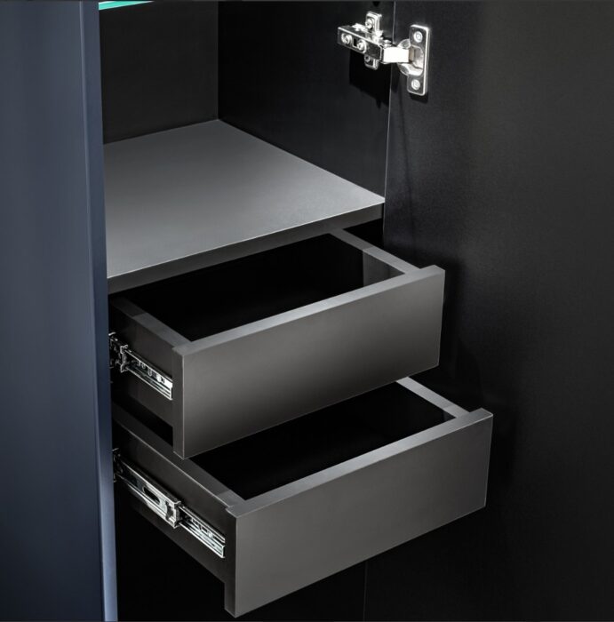 Ez egy merész kollekció, amely mellett nem lehet közömbösen elmenni. A mély sötétkék barázdált előlapokkal kombinálva rendkívüli karaktert ad az egésznek, aminek köszönhetően a kollekció megjelenése a legmagasztosabb vizuális igényeket is kielégíti. A kollekciót aranyszínű fogantyúk egészítik ki, tökéletesen illeszkedve az aktuális trendekhez. Minden bizonnyal minden fürdőszobát felpezsdít, és eleganciájával elragadtatja. Luxus dizájn és merész színek – így jellemezhető a Santa Fe Deep Blue. Az eredeti esztétika nem engedi át a helyét a legmagasabb precíz kivitelezésnek és a fürdőszobabútorok funkcionalitásának ebben a sorozatban. A kollekcióban mosdószekrények, magas szekrény, tükörszekrények, alsó és felső polcok találhatók. A szekrények széles választéka ezt a kollekciót az egyik legmodulárisabbá teszi kínálatunkban, aminek köszönhetően szinte minden méretű fürdőszobába illeszkedik. Ügyfeleink elvárásainak kielégítése érdekében fiókrendszerezővel egészítjük ki ezt a kollekciót. Funkcionális, nem csak a szifonkivágás tökéletes elrejtése miatt, hanem további hasznos helyet biztosít a fiókban.