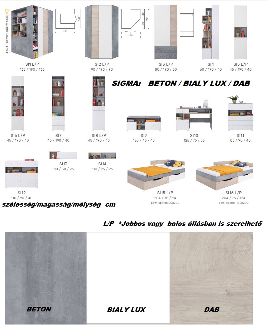 A képen látható szín összeállítás: –BIALY(FEHÉR) matt / BETON (SZÜRKE) matt /DAB(TÖLGY) matt