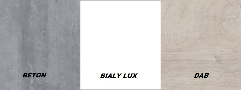 A képen látható szín összeállítás: –BIALY(FEHÉR) matt / BETON (SZÜRKE) matt /DAB(TÖLGY) matt