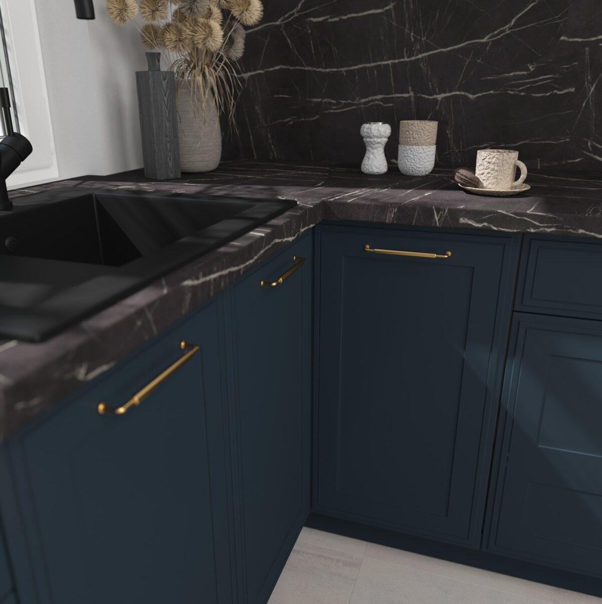 Kontrasztos párosításokkal (fa munkalap, fekete vagy arany/bronz fogantyú) igazán látványos.