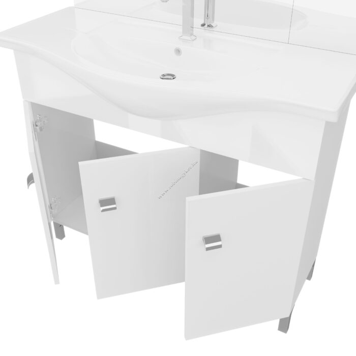 Fürdőszobabútor 105 cm kerámia mosdóval (3 ajtós) + Tükör 99 cm oldalszekrénnyel és LED megvilágítással.