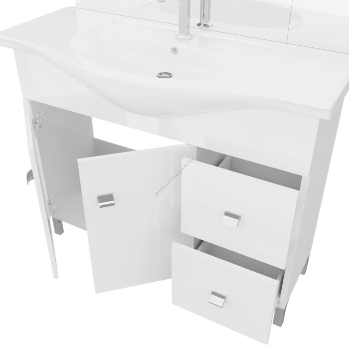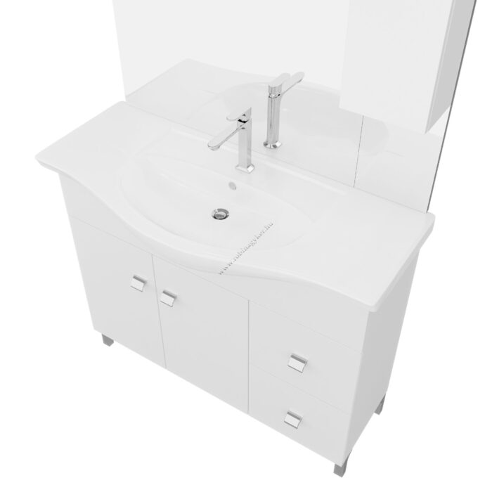 Fürdőszobabútor 105 cm kerámia mozsdóval (2 ajtós + 2 fiokos) + Tükör 99 cm oldalszekrénnyel és LED megvilágítással.
