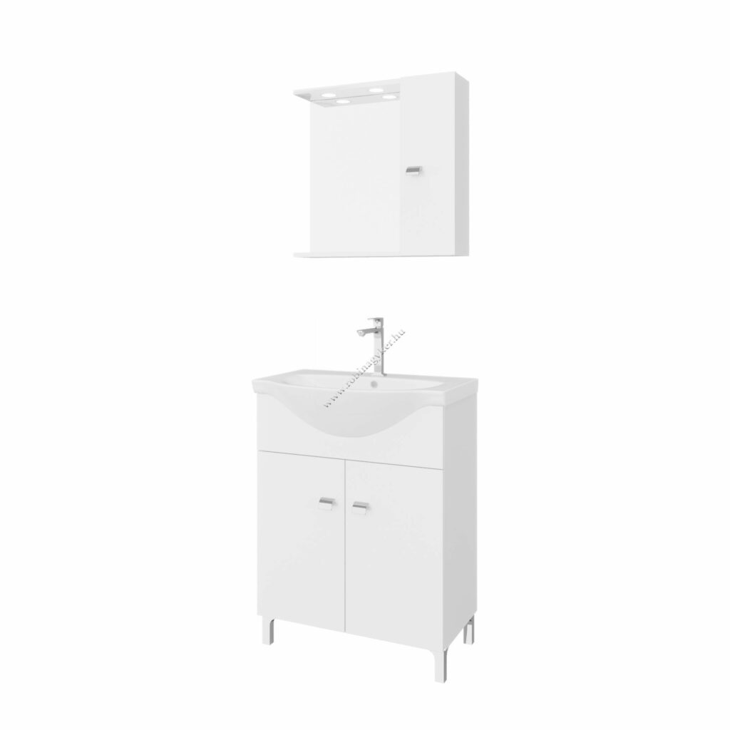 Fürdőszobabútor 55 cm kerámia mosdóval (2 lenyiló ajtós) + Polcos tükör LED spot világátással 52 cm.