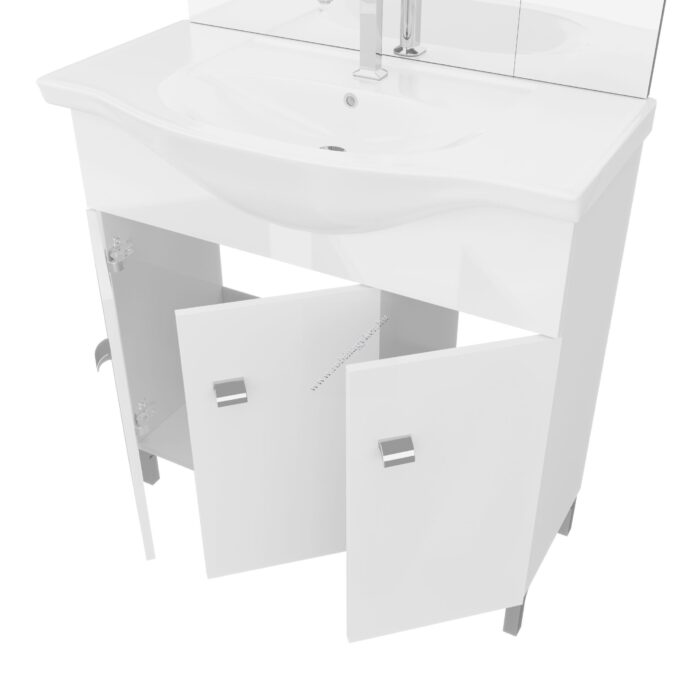 Fürdőszobabútor 85 cm kerámia mosdóval (3 ajtós) + Tükör 80 cm oldalszekrénnyel és LED megvilágítással.