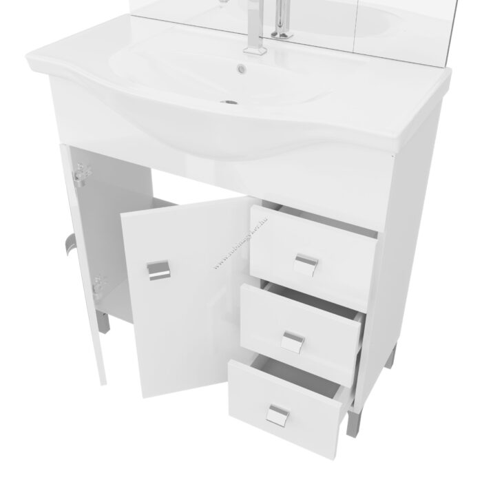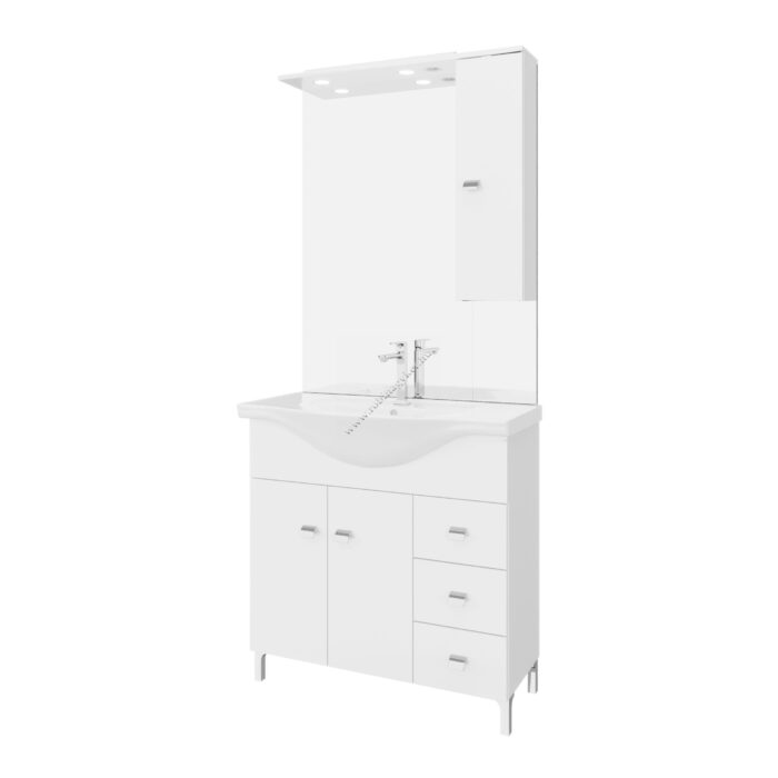 Fürdőszobabútor 85 cm kerámia mozsdóval (2 ajtós + 3 fiokos) + Tükör 80 cm oldalszekrénnyel és LED megvilágítással.