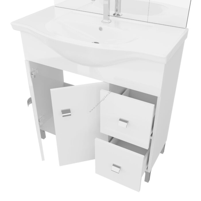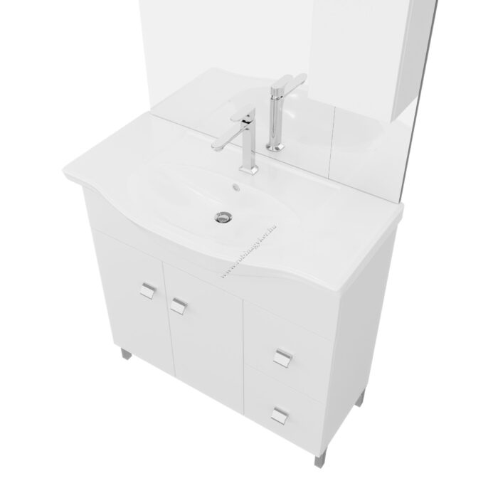 Fürdőszobabútor 85 cm kerámia mozsdóval (2 ajtós + 2 fiokos) + Tükör 80 cm oldalszekrénnyel és LED megvilágítással.