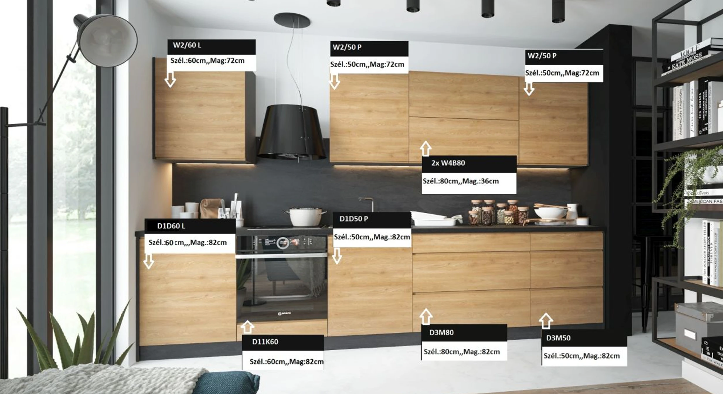 A Pembroke-Black és Dab Halifax-Black frontok ezzel szemben markánsabb, erősebb kontrasztú, hangsúlyosabb hatást keltenek. Kiválóan mutatnak grafit, fekete vagy sötétszürke munkalappal, bronzosabb fém részletekkel, üvegfelületekkel, illetve erőteljesebb kontrasztokat használó enteriőrökben. Ezek a frontszínek kiforrottabb, karakteresebb összképet eredményeznek, ezért különösen jól állnak loftos, modern-rusztikus vagy férfiasabb hangulatú terekben. Ugyanakkor nem nehézkesek, mert a fa erezetének természetes ritmusa oldja a túlzott komolyságot, és megőrzi a meleg, lakályos benyomást.