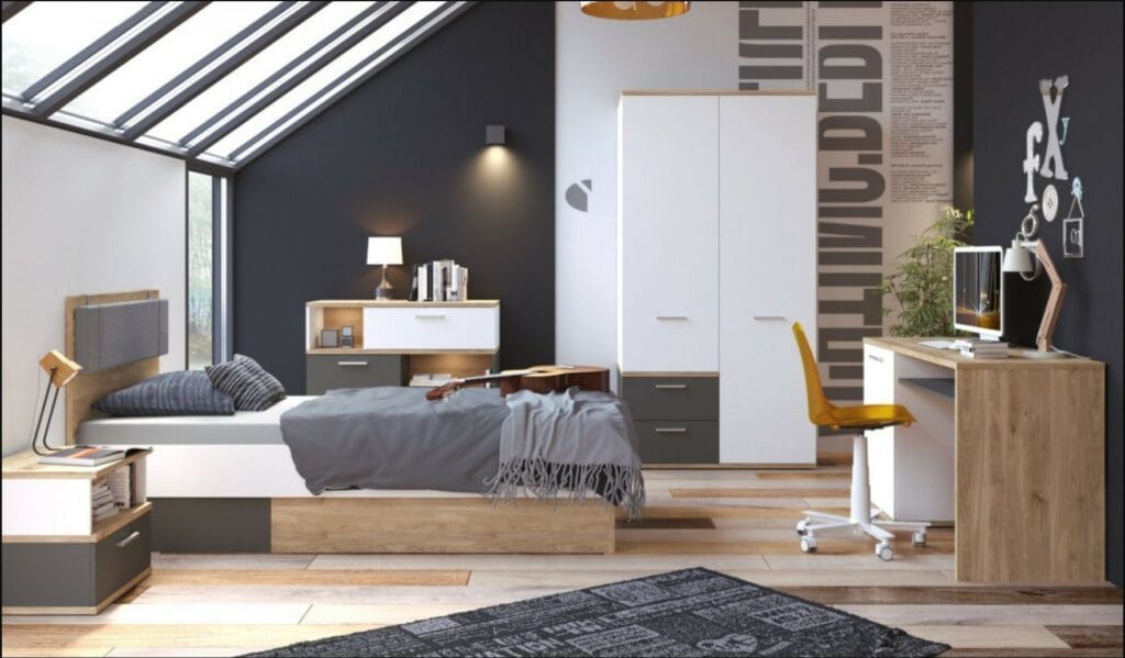 A Twenty kollekciót egy ifjúsági szobának szentelték. Kiegészítheti innovatív LED világítással, spotlámpákkal és az ágy fejére erősített modern textil panelekkel. Fedezze fel korlátlan lehetőségeit a belső tér teljes vizuális hatásának megváltoztatására a kiegészítők stílusának és színének gyors módosításával. A lágyan záródó zsanérok és a teljesen kihúzható fiók sínek biztosítják a kényelmes használatot.