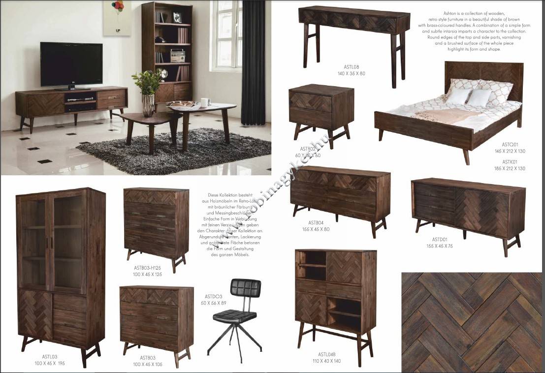 Az Ashton kollekció retro stílusú, fából készült bútor, gyönyörű, barna színű, sárgaréz fogantyúval. Egy egyszerű forma és egy finom betét kombinációja ad a kollekciónak egy karaktert. A felső és az oldalsó oldalak lekerekített élei, az egész bútor lakkozása és csiszolt felülete hangsúlyozza a formát és az alakot. Az ajtóban használt pántok könnyű és csendes mozgást tesznek lehetővé. A bútorok a legmagasabb minõségû anyagokból készülnek, stabilak és ugyanakkor jellegzetes formájuk minden szobában megfelelnek. A stílusos és elegáns bútorok az Ashton kollekcióból, köszönhetően a termékek széles választékának, minden szoba, étkező, nappali vagy háló térnek egyedi megjelenést biztosít.