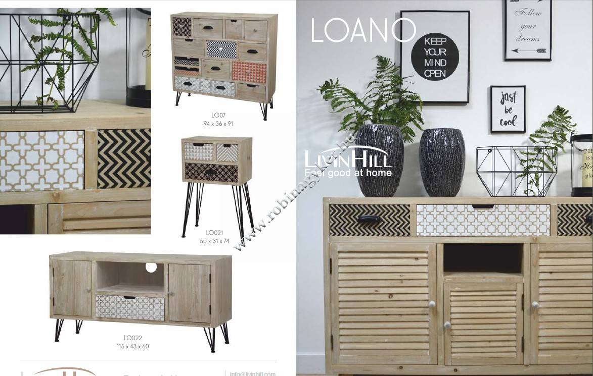 A LOANO kollekcióból készült bútorok modern formája egyenlő a bohókásan és hanyagul összevágott frontok világosított testek keretébe foglalva. Az egyszerű formát kiegészíti a fiókos eredeti formatervezés. A fa, fém lábak és szerelvények kombinációja, valamint az eredeti kivitelezés a LOANO kollekciót a modern és a klasszikus belső térbe is szépen illeszti be. A gyűjtemény konzolokból, tálalóból, szekrényekből, könyvespolcokból és íróasztalokból áll.