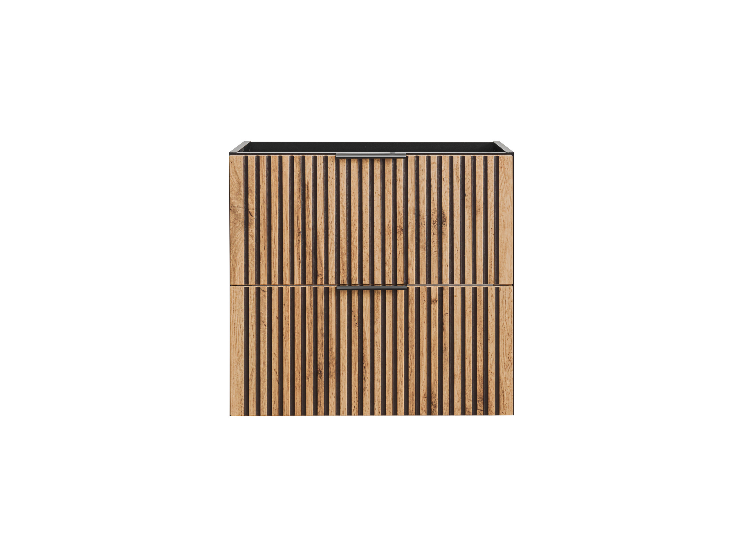 Elegáns, falra szerelhető kialakítás, ritmikus lamellás fronttal. A fiókok praktikus tárolást adnak a napi használatú holmiknak, miközben a tér légies marad.
